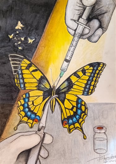 "En ensayo de de luz", la mariposa es intervenida: una sustancia le es inyectada para provocar brillo, luminosidad, apariencia de vitalidad. la luz no nace del cuerpo es impuesta.