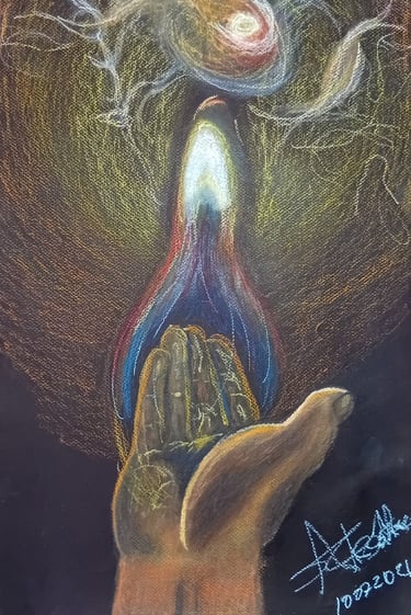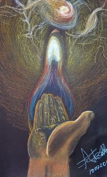 Un fuego que arde sin consumir, sin dañar: la energía creativa asciende como un impulso vital que ilumina sin herir, dando forma aun acto de creación consciente.